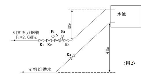 如圖2所示:在壓力鋼管進機組處的位置附近取水。K1、K2分別這取水閥和工作閥,Y為ZJY46H-40C DN150減壓閥。P2的壓力整定為0.6MPa,減壓后的水直供水池,再由水池供兩臺機組用水。調節閥門K3為合適的過流面積。改進前的單臺ZJY46H-40C DN150減壓閥的流量在滿足兩臺機組運行時,運行噪音為118dB。